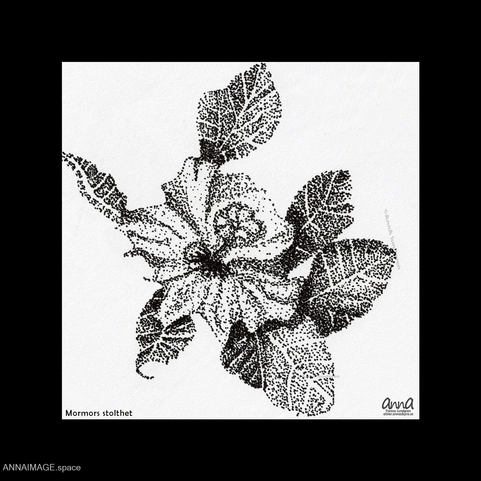 Min mormor – bodde i Åbolandsskärgård i Finland. Hon älskade blommor och detta är en tuschteckning av hennes ”Dubbla Hibiskus”. Dess stickling finns faktiskt på flera ställen i Sverige.